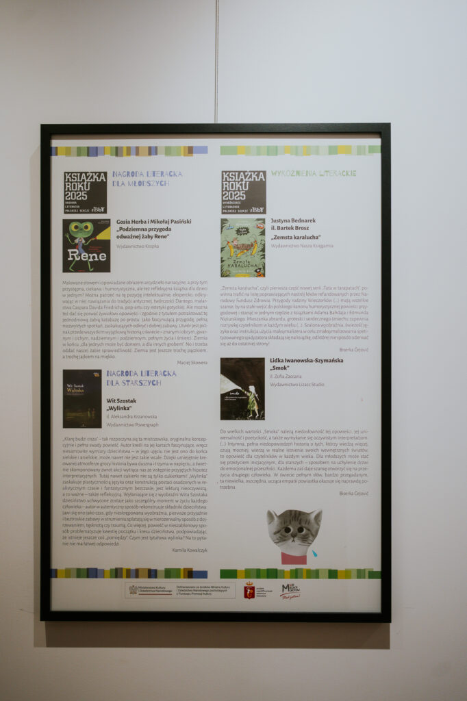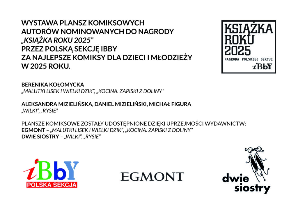 „Książka Roku Polskiej Sekcji IBBY 2025” to wystawa poświęcona najciekawszym zjawiskom we współczesnej polskiej książce dla dzieci i młodzieży. Konkurs organizowany przez Polską Sekcję IBBY co roku nagradza wartościowe książki w kategoriach literackiej i graficznej, a także osoby i instytucje, które w szczególny sposób upowszechniają czytelnictwo. W 2025 roku po raz pierwszy wyodrębniona została również kategoria komiksowa, podkreślająca rosnącą rolę narracji obrazowej i sekwencyjnej w literaturze dla młodych odbiorców.